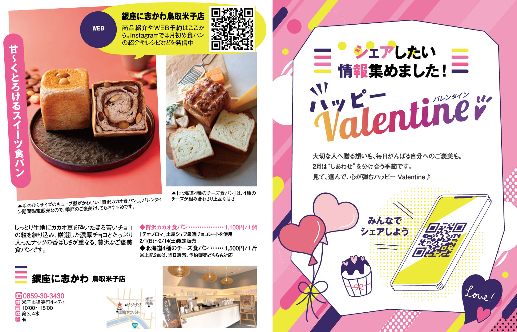 ハッピーバレンタイン特集にて銀座に志かわ「鳥取米子店」並びに「贅沢 カカオ食パン」と「北海道4種のチーズ食パン」をご紹介いただいています。