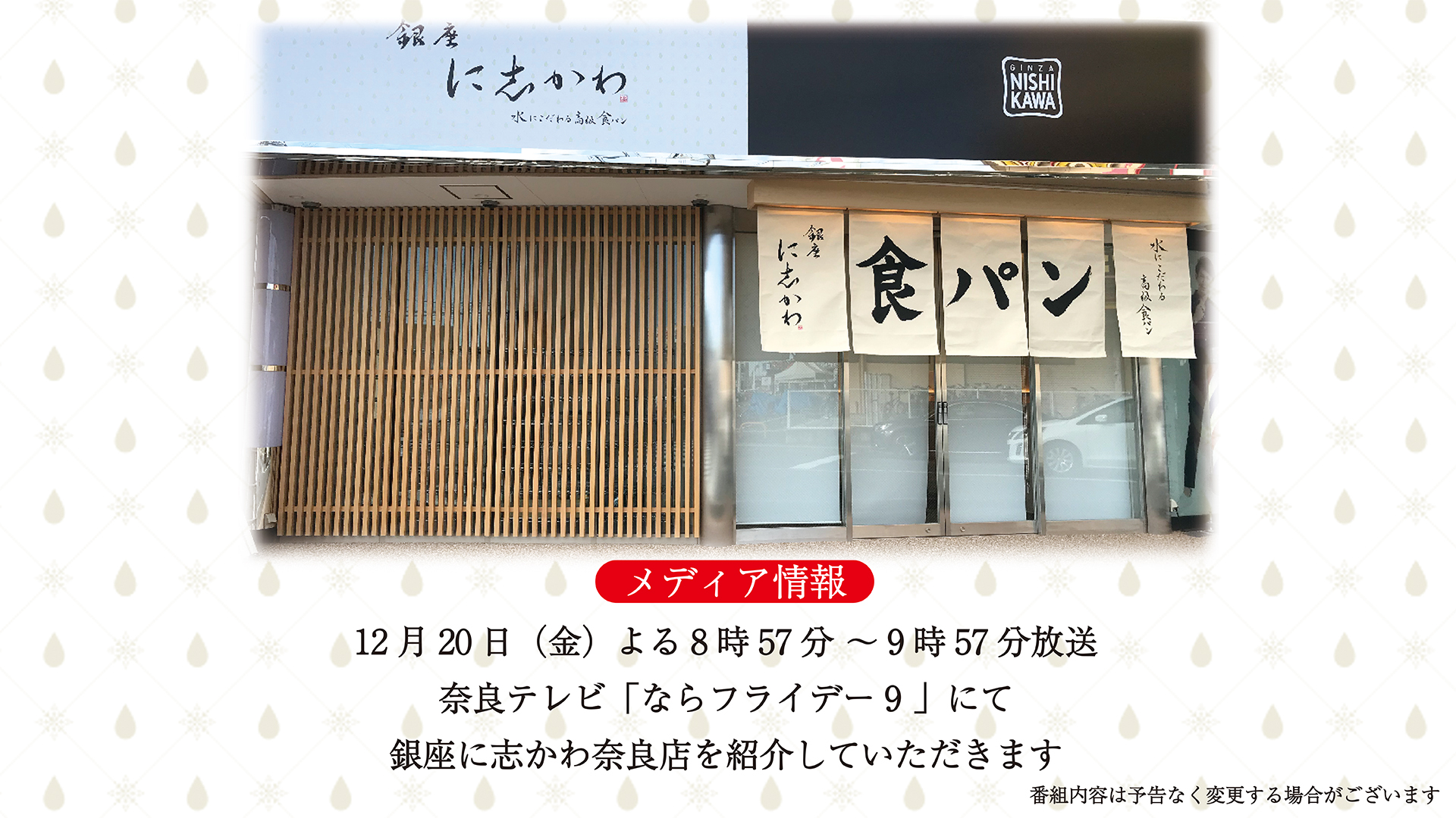 12月20日(金)奈良テレビ「ならフライデー9」にて銀座に志かわ奈良店を紹介していただきます。