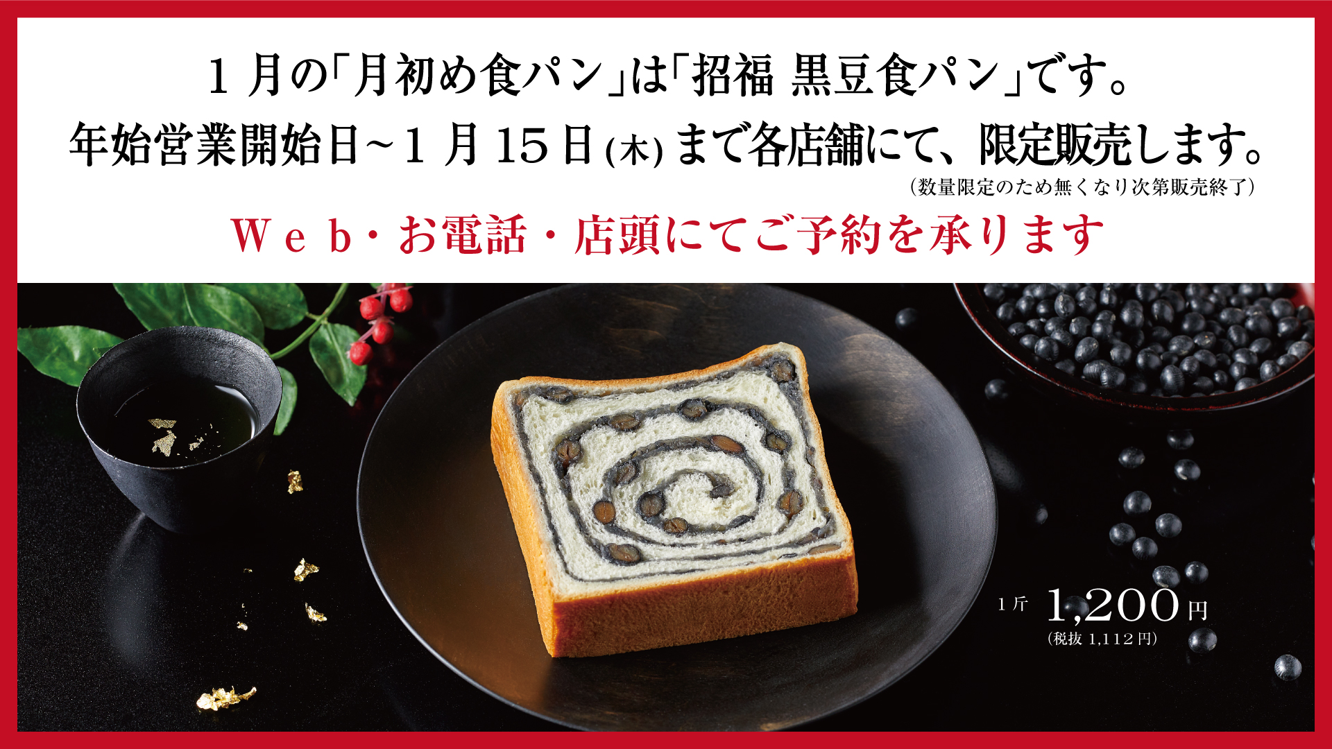 1月の「月初め食パン」は「招福 黒豆食パン」です。年始営業開始日~1月15日(木)限定販売です