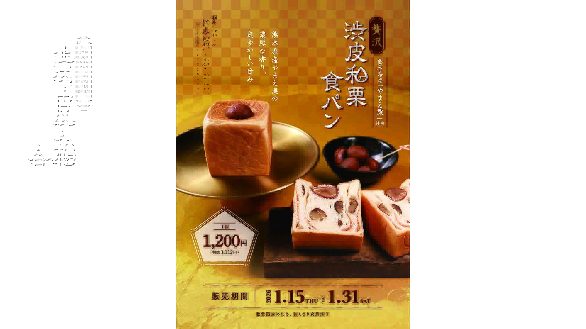 熊本県産 極上ブランド和栗「やまえ栗」を使用した「贅沢 渋皮和栗食パン」。1月15日(木)より限定販売。