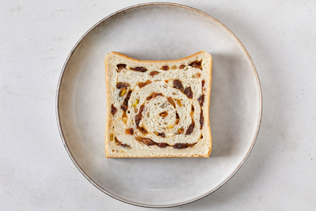 りんご、レモン、オレンジ、レーズンの色とりどりの洋酒漬け果実とホワイトチョコレート、ピスタチオを絹のようにしっとりした口どけの食パン生地全体に宝石のように贅沢に散りばめました。